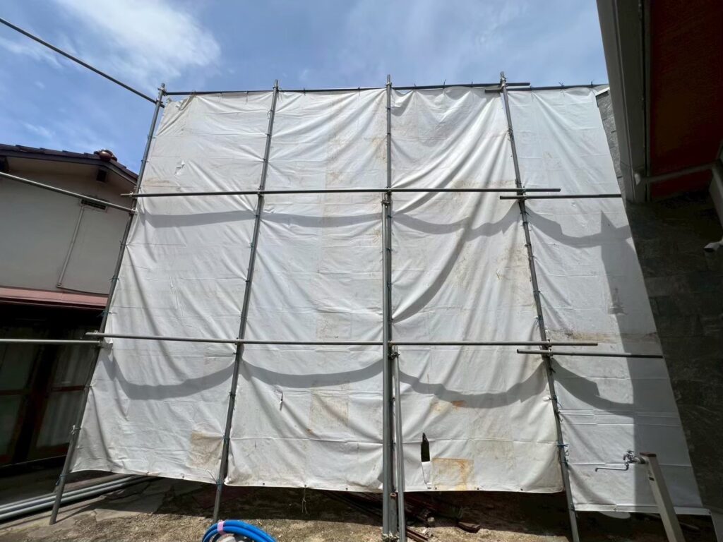 施工中の写真にある通り、白い養生シートを隙間なく張り巡らせることで、破片の飛散を完璧に防いでいます。泉田エリアは風が強く吹く日もあるため、シートがめくれないよう足場をしっかりと固定する技術が求められます。株式会社アライブの職人は、近隣への配慮を第一に考え、毎日作業終了後の清掃も欠かさず実施いたしました。