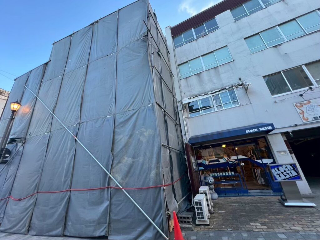表町エリアの解体工事における最大の特徴は、商店街のアーケードに隣接している物件や、隣の建物と数センチ単位で接している狭小地が多いことです。今回ご紹介する施工実績では、まさにそうした密集地での工事を完遂いたしました。施工前の写真(before)をご覧いただくと分かる通り、防音・防塵のための養生シートが建物を隙間なく覆っています。これは単に汚れを防ぐだけでなく、通行人の安全確保と、隣接する店舗への営業影響を最小限にするための重要な工程です。