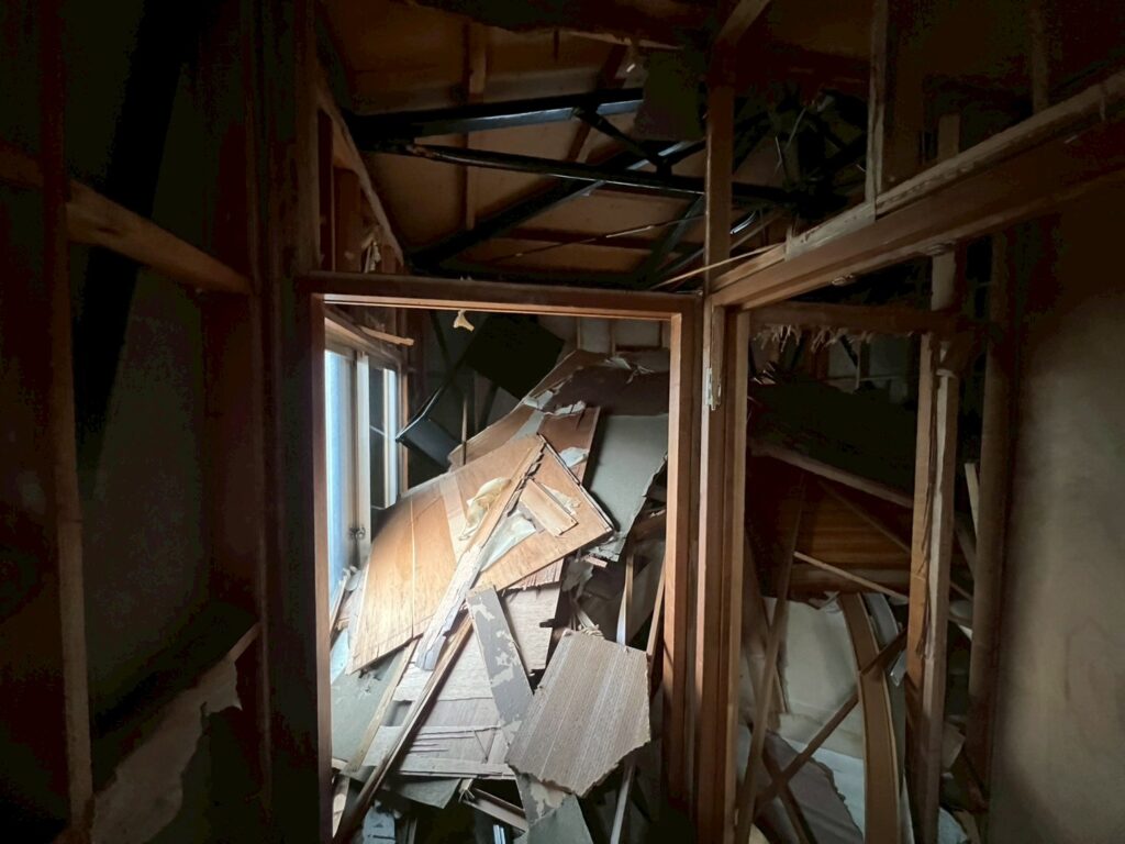 お送りした写真(before)をご覧いただくとわかる通り、室内は屋根の重みに耐えかねた梁や天井材が大きく崩れ落ちている状態でした。このような崩落現場では、スタッフが内部に立ち入る際に崩落に巻き込まれる危険があるため、通常以上に慎重な足場組みと重機操作が求められます。